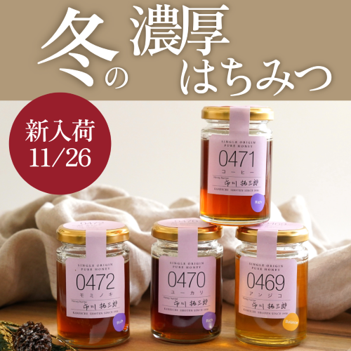 金市商店では、蜂蜜の買い付けはハニーハンターの市川拓三郎がすべて行っています。春になり、ミツバチが活動し始めると、全国各地にいる養蜂家を訪ね、現地で蜂蜜を実際に目で見て、匂いと味わいなどをチェックし、納得する品質の蜂蜜だけを買い付けます。そして蜂蜜をできるだけ早く、京都の工場に送り、瓶詰してお客様にお届けします。その採れたてのフレッシュな蜂蜜を「新蜜」としてお客様にお届けします。