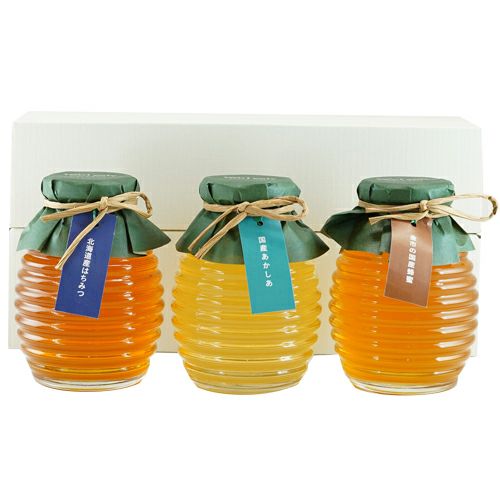 画像拡大 商品番号 Gift-NH3-44 国産蜂蜜3種食べ比べセット [ 55 ポイント進呈 ] 期間限定 ¥ 5,508 税込 のし・包装(必須) 選択してください 不要 包装のみ 包装+内のし 包装+外のし のしの用途(必須) 選択してください 不要 お歳暮 お中元 お年賀 御礼 紅白無地のし 御祝 ご結婚御祝 内祝 結婚内祝 お見舞(病気) 志 御供 粗供養 その他(通信欄へ記入) お渡し用袋(必須) お渡し用袋をお選びください。 選択してください 不要(+¥0 税込) 必要(+¥55 税込) お気に入りに登録する 1 2 3 4 5 6 7 8 9 10+ カートに入れる 商品についてのお問い合わせ 商品説明 国産蜂蜜3種食べ比べセット ミツバチの巣をイメージした可愛い瓶に蜂蜜たっぷり。 定番の蜂蜜3種類を食べ比べできるセットです。 蜂蜜はそれぞれ採れる花によって異なる個性がございます。 その繊細な味わいの食べ比べを楽しんだり、朝食やティータイム、お料理など様々なシーンで活用でき、蜂蜜の楽しさが広がります。 かわいい瓶が好きな方、たくさん蜂蜜を使われる方におすすめです。 【セット内容】 国産あかしあ蜂蜜、金市の国産蜂蜜、国産北海道蜂蜜 各200g ●国産あかしあ蜂蜜 色は透明に近くクセもないため人気が高い蜂蜜。程よい甘さで何にでも相性が良いです。紅茶におすすめです。 ●金市の国産蜂蜜 日本全国様々な花から採れる蜂蜜をオリジナルブレンド。コクのある濃厚な甘みと蜂蜜らしさが特徴でお料理におすすめです。 ●国産北海道蜂蜜 北海道内に咲く個性豊かな花々から採れる蜂蜜をオリジナルブレンド。しっかりとした甘みと後口のさわやかさが特徴です。チーズやパンケーキにおすすめ。 ※ギフト箱代を含んだ価格となっているので、ギフト箱のご指定は不要です。 ※のし・かけ紙をご希望された場合、備考欄に記入がなければ内のし、名入れ無しでお届けいたします。 レビュー投稿で、蜜蜂ポイント(38ポイント)プレゼント! 5.00 1 蜂蜜大好き 1 購入者 非公開 投稿日 2024/11/06 お世話になった方への贈り物として度々利用しています。見た目も可愛く、美味しい国産蜂蜜の食べ比べができるので、いつもとても喜んでもらえます。 すべてのレビューを見る レビューを書く 秋は蜂蜜酒(ミード)が美味しい季節 メール便で簡単受取。ポストに届く蜂蜜 今年採れたての蜂蜜いかがですか 忙しいあなたへ。スティックタイプの蜂蜜が手軽で便利! 人気ランキング はちみつ商品 1 【30%OFF】マルチフローラルマヌカハニー|スティックハニープラス|ニュージーランド産|160g(8g×20本) 2,160円 ⇒ 1,512円 税込 2 スティックハニープラス ハニーハンターセレクト10種類食べ比べ|国産蜂蜜 1,296円 税込 3 国産あかしあ蜂蜜500g 3,996円 税込 4 檸檬(レモン)蜂蜜漬|国産果実使用|350g 1,080円 税込 蜂蜜酒(ミード) 1 The MEAD 紅白ギフトセット(The MEAD & The MEAD さくら)|京都蜂蜜酒醸造所|各250ml 4,400円 税込 2 ヤドヴィガ|極甘|750ml|ポーランドミード|アピス 6,930円 税込 3 The MEAD(ザ・ミード)|京都蜂蜜酒醸造所 3,850円 税込 4 ルベルスキ(編みカゴ入り) |極甘|750ml 7,700円 税込 “当たり年”の特別なれんげ蜂蜜 新登場 10年に一度の咲きっぷり 【大阪・関西万博で高評価】98%が“美味しい”と回答! 「生はちみつ」が普通のはちみつよりすごいってホント? 【蜂蜜酒 ミード】はちみつのお酒ってこんなお酒 手軽においしく、毎日の健康習慣をサポートする「スティックハニープラス」大袋シリーズ メール便で簡単受取。ポストに届く蜂蜜 蜂蜜から造った人類最古のお酒「蜂蜜酒(ミード)」優しい甘さのお酒です 新商品、入荷しました。ぜひご賞味ください。 お知らせ 2026.2.3 蜂蜜がもっと好きになるハニーライフマガジン「HONEY TIME vol.68」発行 2026.2.2 はじめての一杯から、ミードのある日常へ。 京都蜂蜜酒醸造所2周年に合わせた新作ミード発売 2026.1.27 春の贈り物や自分のご褒美にも選びたい 香り豊かな「さくら蜂蜜」大集合の【桜フェア】開催 2025.12.26 免疫ケアに寄り添う1か月。 試して、選んで、続けられる。 “はじめてのマヌカハニー” キャンペーン開催(2026.1/14~)