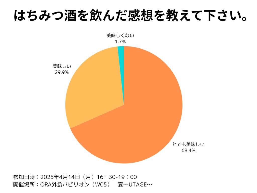 私たちは翌日の4月14日、ORA外食パビリオン「宴~UTAGE~」にて、蜂蜜から造る醸造酒「蜂蜜酒(ミード)」のプロモーションと来場者アンケートを実施しました。