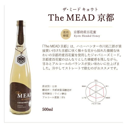 京都蜂蜜酒醸造所のフラッグシップミードである『The MEAD(ザ・ミード)』は、ハニーハンター市川拓三郎が全国の養蜂家さんをめぐり、直接仕入れた様々な蜂蜜の特徴を活かしてオリジナルブレンドした国産蜂蜜を使用して醸造。