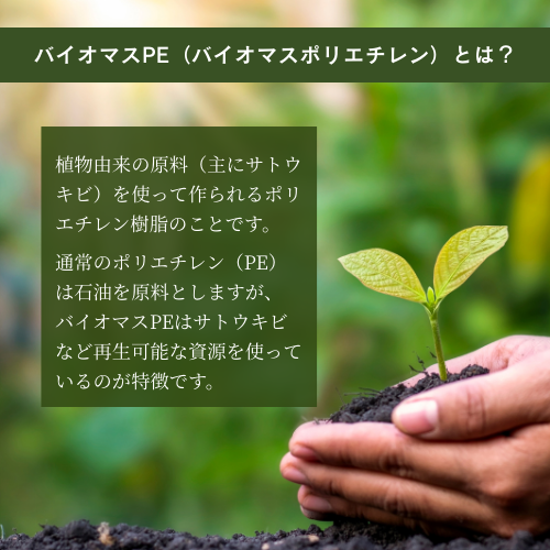 バイオマスPE(Bio-based Polyethylene)は、植物由来の原料(主にサトウキビ)を使って作られるポリエチレン樹脂のことです。通常のポリエチレン(PE)は石油を原料としますが、バイオマスPEはサトウキビなど再生可能な資源を使用しているのが特徴です。