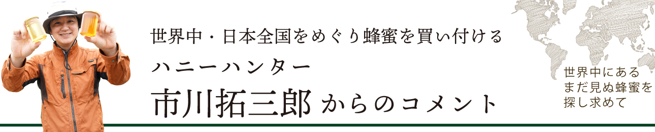 私ハニーハンター市川拓三郎は、全国の養蜂家をめぐり蜂蜜を仕入れています。